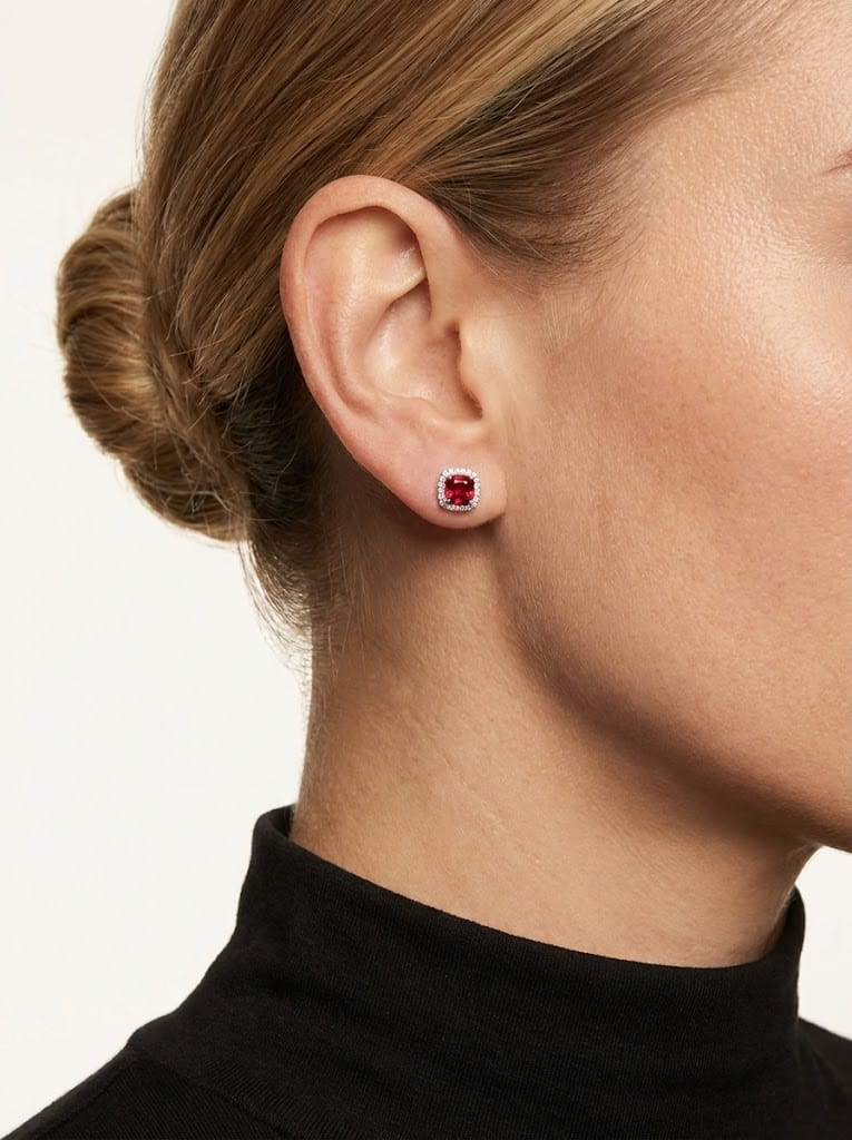 Heart Ruby Stud Earrings with Diamond Halo